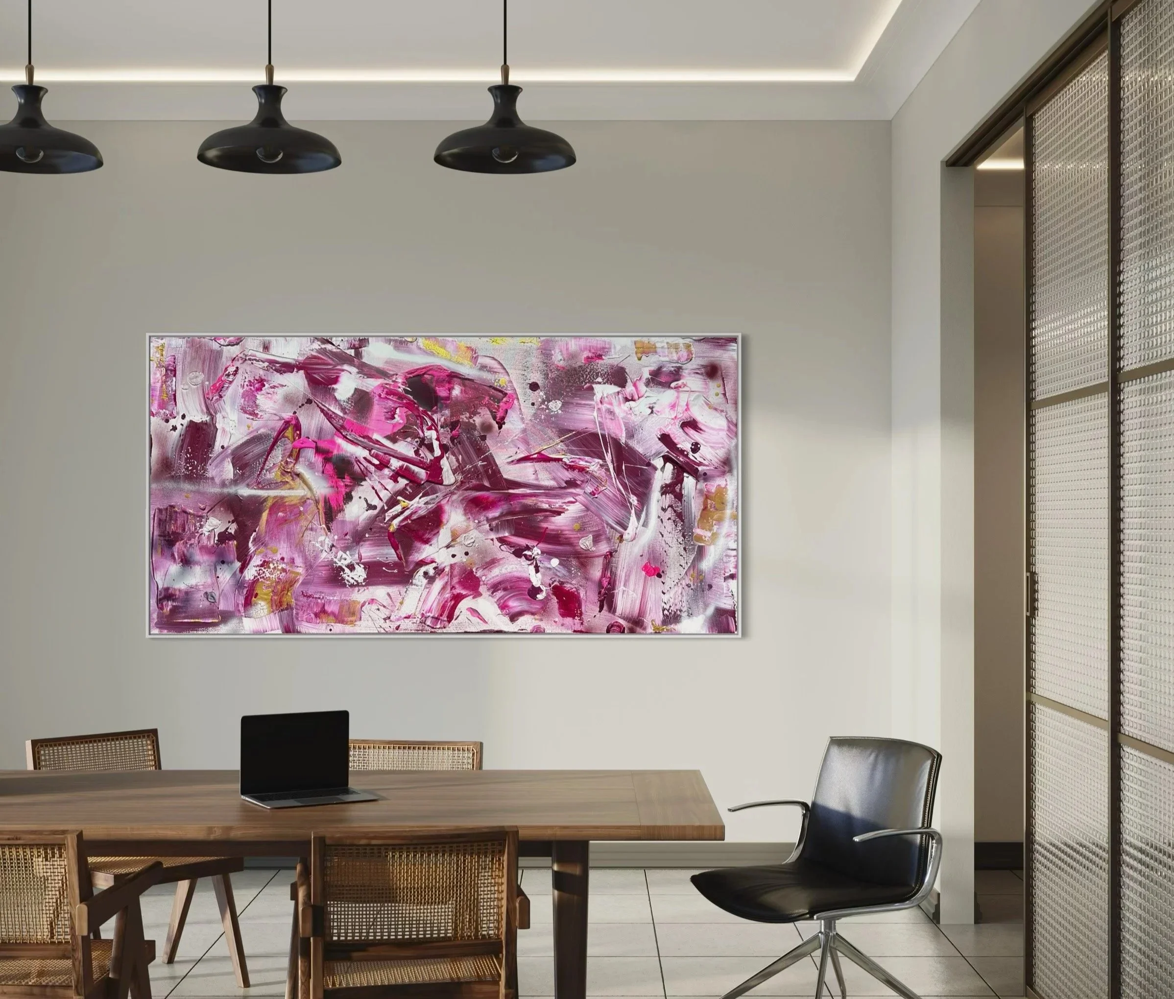 Ich entwickle Werke die zu eurer Raumgröße, euren Markenfarben und der Atmosphäre passen, die ihr schaffen möchtet. Ausgangspunkt ist immer euer Corporate Branding – Farben aus Website, Logo oder Inneneinrichtung fließen direkt ins Werk ein. Vom ersten Gespräch bis zur Übergabe begleite ich euch persönlich.